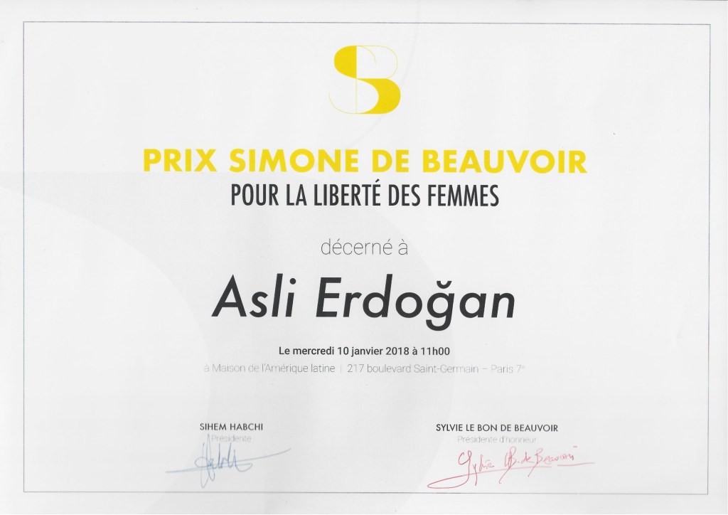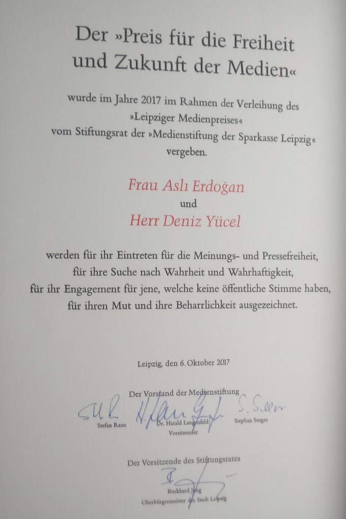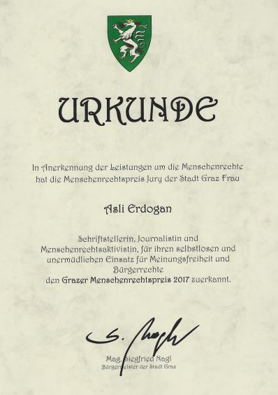 Prize for Future and Freedom of Media (2017, Germany, Leipzig) https://www.ecpmf.eu/archive/news/awards/asli-erdoan-for-all-the-journalists-with-their-tongues-cut-out-solidarity-is-important.html