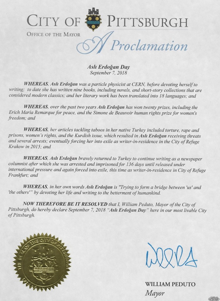 33- September 7th 2018, declared as Day of Asli Erdogan in Pittsburgh
