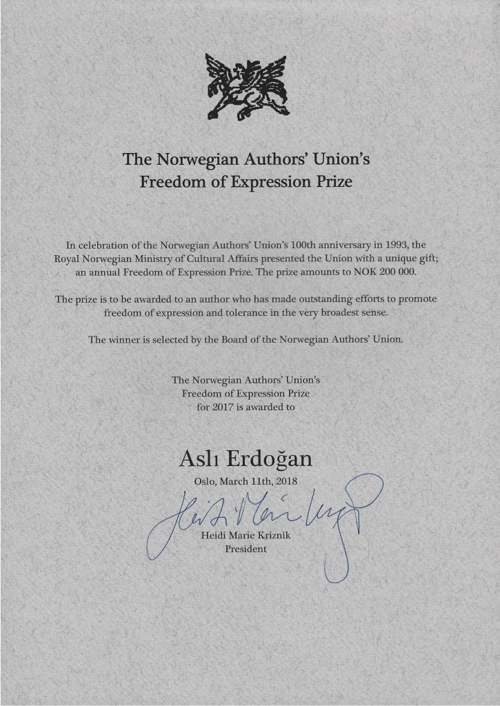 Nowegian Authors Union Freedom of Expression Prize (2019, Norway) https://en.wikipedia.org/wiki/Norwegian_Authors_Union_Freedom_of_Expression_Prize