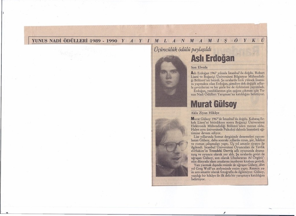Deutsche Welle organized a literary competition every two years for a different language each time. The sixth and the last was for Turkish. Twenty stories amongst 830 were chosen by the Turkish jury to be translated for the international jury. Aslı Erdoğan won the major prize with her story “The Wooden Birds”, which was published as a book in German “Holzvögel” and Turkish ’Tahta Kuşlar’ by Deutsche Welle sponsoring.