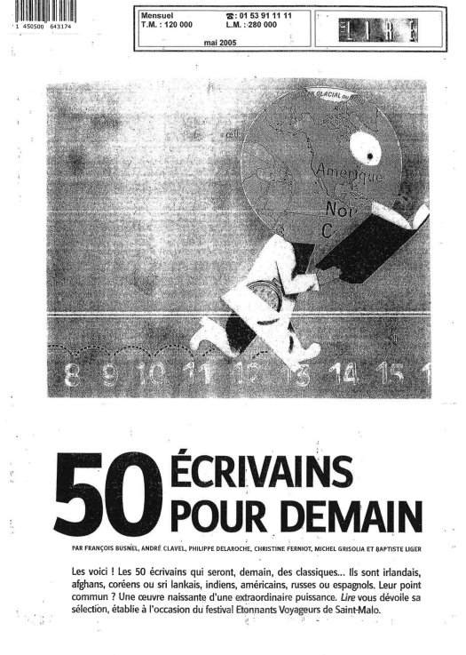 5- Chosen amongst the “50 WRITERS of FUTURE” by French literary Magazine LIRE, May 2005.