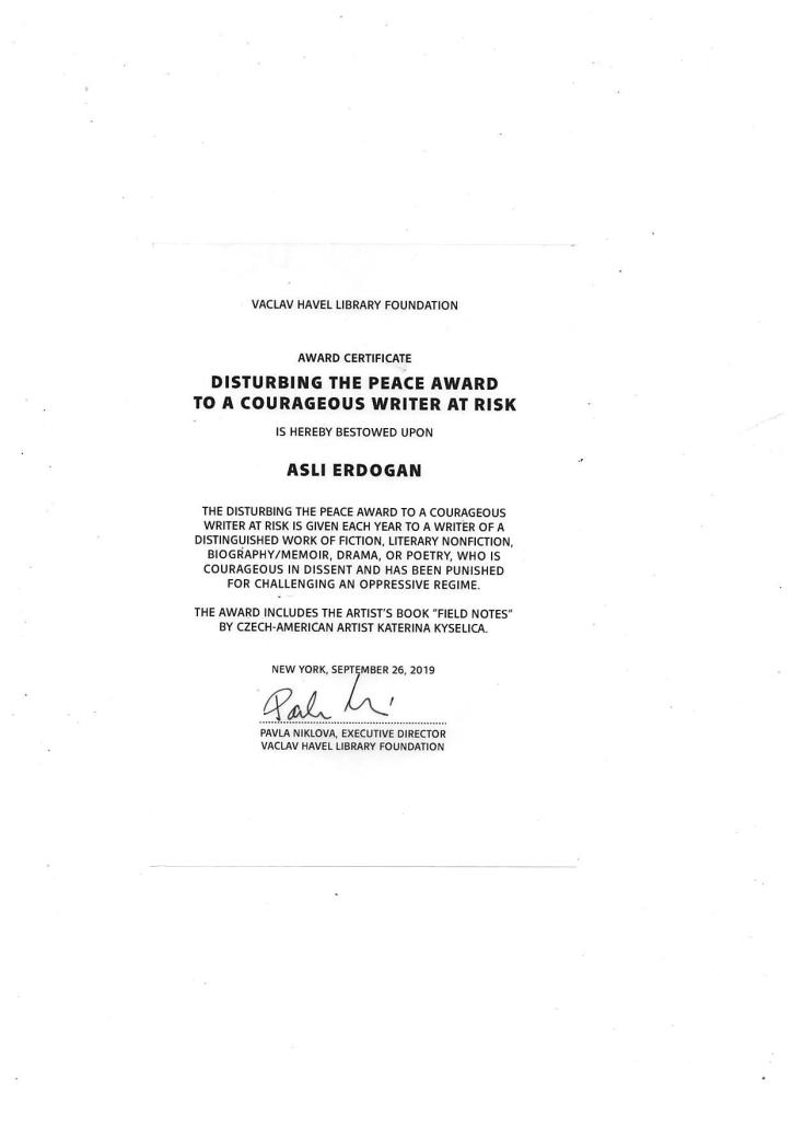Medal of Chevalier des Arts et des Lettres (2018, France) https://www.livreshebdo.fr/article/francoise-nyssen-decore-asli-erdogan-dans-lordre-des-arts-et-des-lettres
